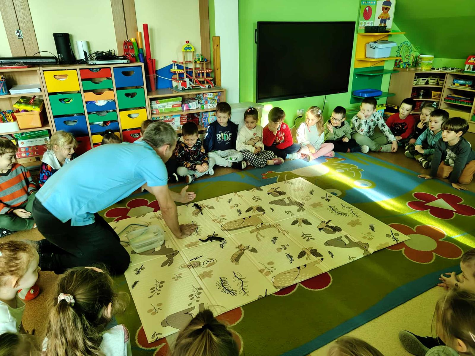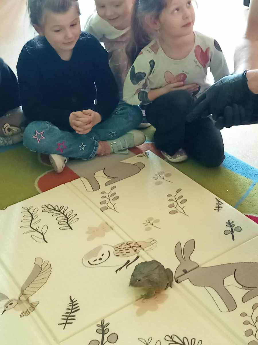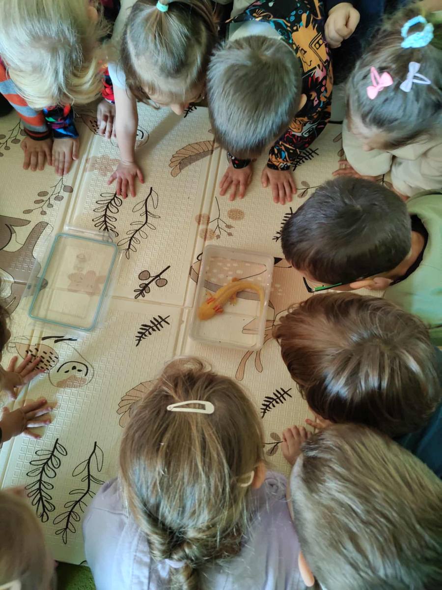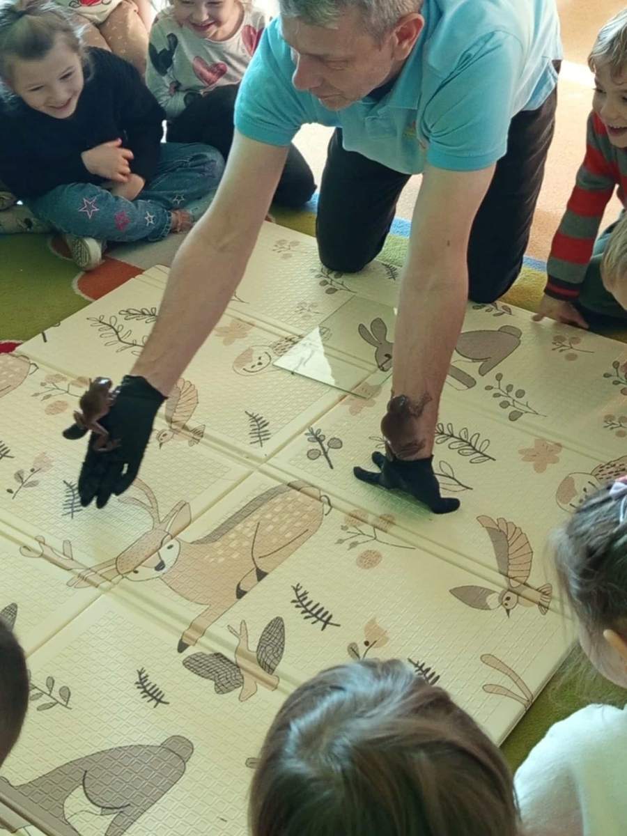 Nasze przedszkolaki uczestniczyły w kolejnych fascynujących zajęciach z cyklu „Owady i Spółka”, podczas których przeniosły się w świat niezwykłych mieszkańców stawu. Tematem spotkania były płazy, a dzięki prowadzącemu dzieci mogły z bliska przyjrzeć się tym często niedocenianym, a jakże ciekawym zwierzętom. Podczas zajęć dzieci zobaczyły między innymi salamandrę, duże zainteresowanie wzbudziła również największa kijanka na świecie – jej nietypowy rozmiar wywołał wiele pytań i zachwytów. Nie zabrakło także spotkania z żabą i ropuchą, udało nam się również zobaczyć malutkie, niezwykle szybkie kumaki, słynące z wyjątkowego refleksu. Uczestnicy poznali także „wieczne dziecko” – zwierzę, które nigdy nie dorasta, zachowując przez całe życie młodzieńcze cechy. Choć zwierząt nie można było dotykać – wszystko ze względu na ich dobro – dzieci mogły z bardzo bliska je obserwować, zadawać pytania i dowiedzieć się, jak wygląda życie płazów w ich naturalnym środowisku. Zajęcia były pełne wiedzy, humoru i niespodzianek. Przedszkolaki wróciły do sal bogatsze o nowe doświadczenia oraz ciekawostki, które z pewnością długo będą pamiętać. Już nie możemy się doczekać kolejnego spotkania z cyklu „Owady i Spółka”!