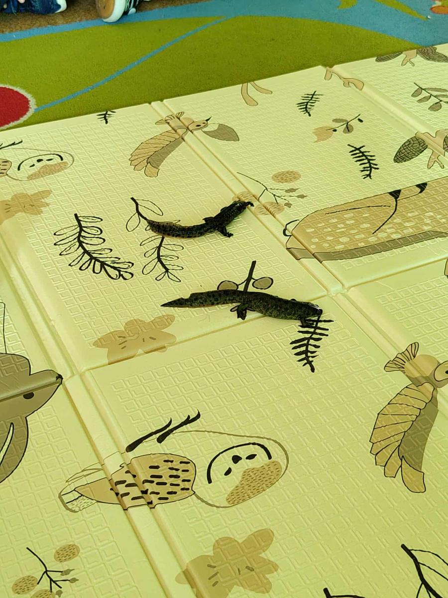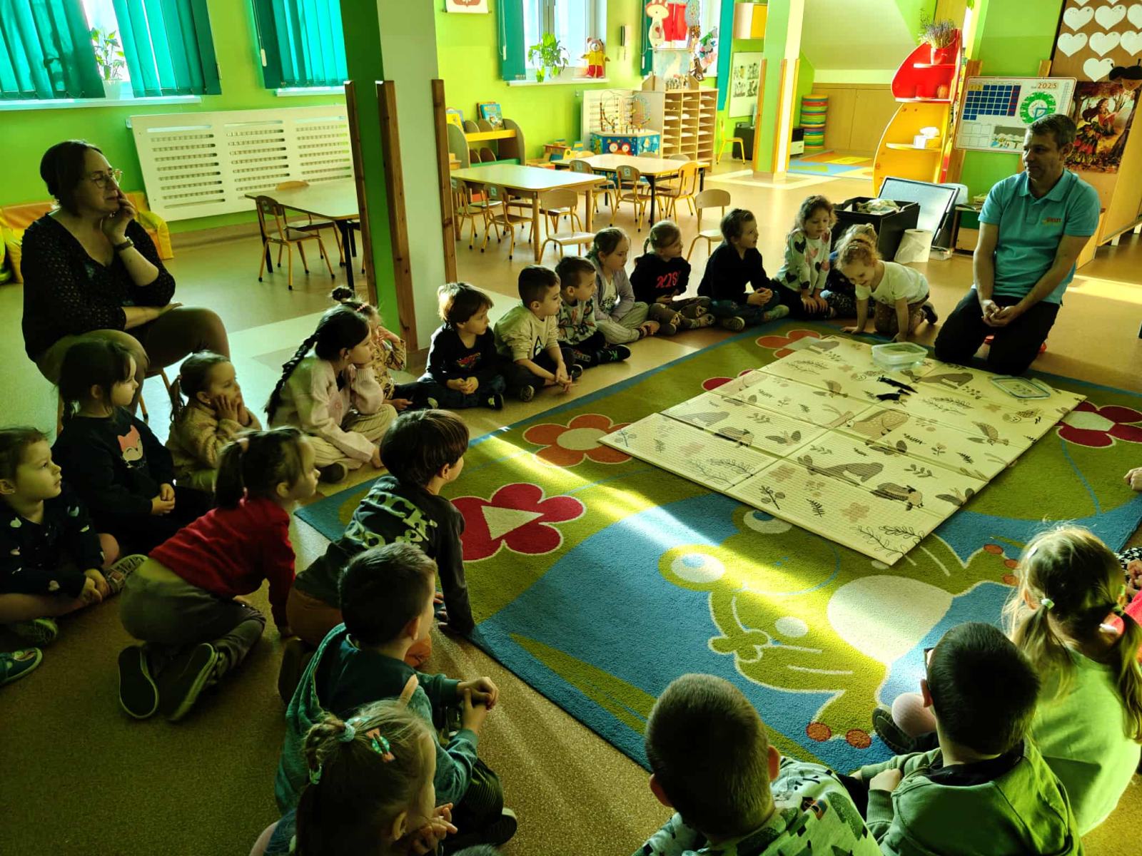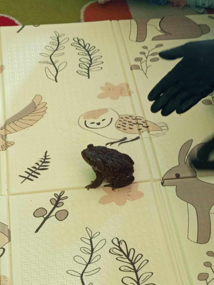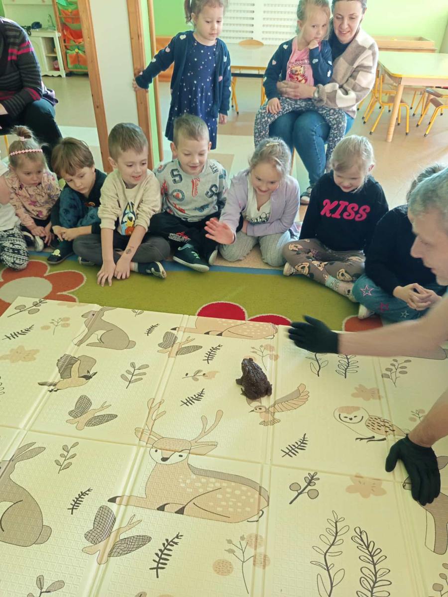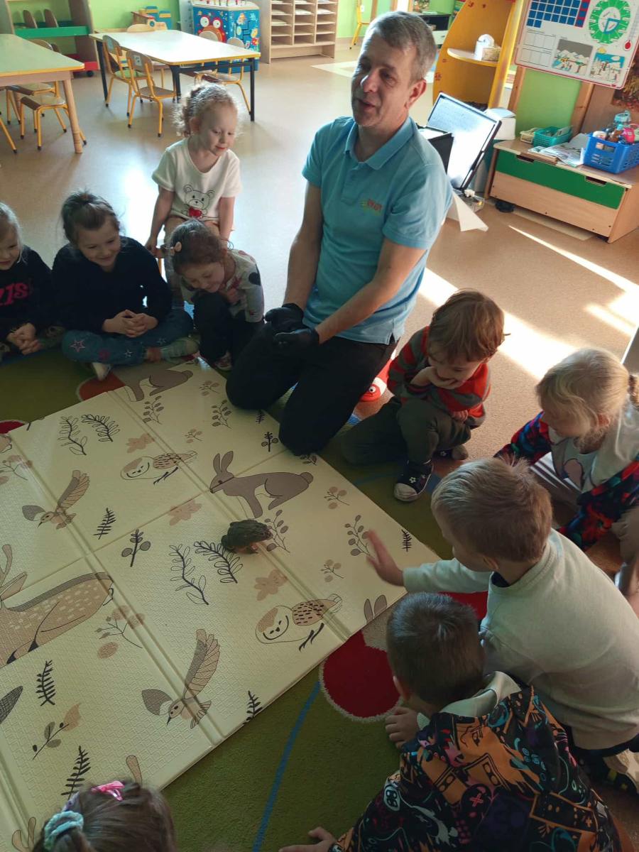 Nasze przedszkolaki uczestniczyły w kolejnych fascynujących zajęciach z cyklu „Owady i Spółka”, podczas których przeniosły się w świat niezwykłych mieszkańców stawu. Tematem spotkania były płazy, a dzięki prowadzącemu dzieci mogły z bliska przyjrzeć się tym często niedocenianym, a jakże ciekawym zwierzętom. Podczas zajęć dzieci zobaczyły między innymi salamandrę, duże zainteresowanie wzbudziła również największa kijanka na świecie – jej nietypowy rozmiar wywołał wiele pytań i zachwytów. Nie zabrakło także spotkania z żabą i ropuchą, udało nam się również zobaczyć malutkie, niezwykle szybkie kumaki, słynące z wyjątkowego refleksu. Uczestnicy poznali także „wieczne dziecko” – zwierzę, które nigdy nie dorasta, zachowując przez całe życie młodzieńcze cechy. Choć zwierząt nie można było dotykać – wszystko ze względu na ich dobro – dzieci mogły z bardzo bliska je obserwować, zadawać pytania i dowiedzieć się, jak wygląda życie płazów w ich naturalnym środowisku. Zajęcia były pełne wiedzy, humoru i niespodzianek. Przedszkolaki wróciły do sal bogatsze o nowe doświadczenia oraz ciekawostki, które z pewnością długo będą pamiętać. Już nie możemy się doczekać kolejnego spotkania z cyklu „Owady i Spółka”!