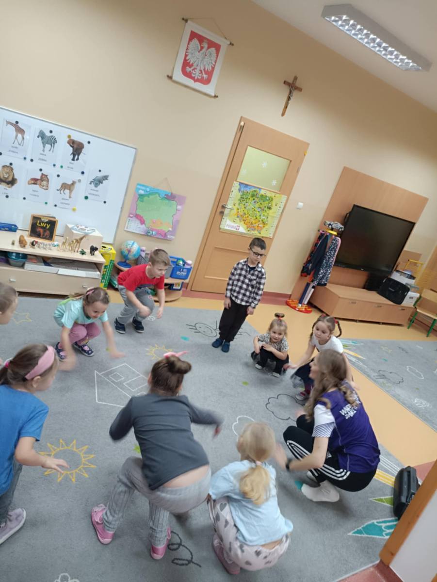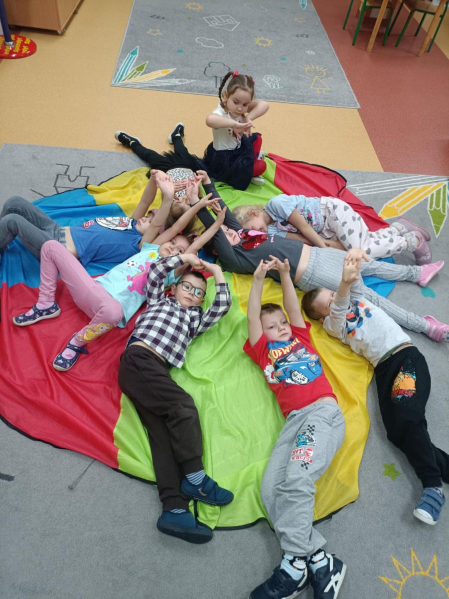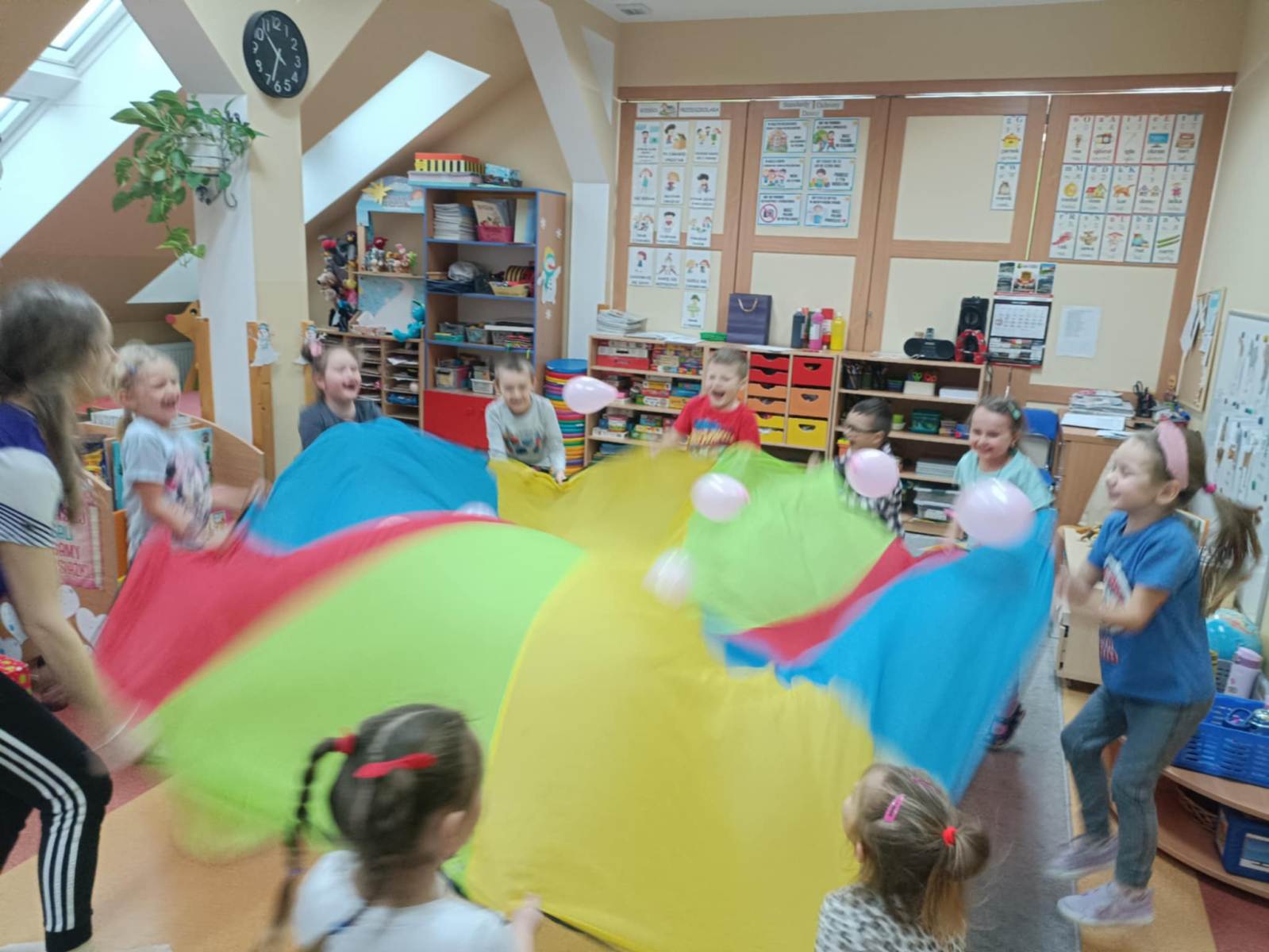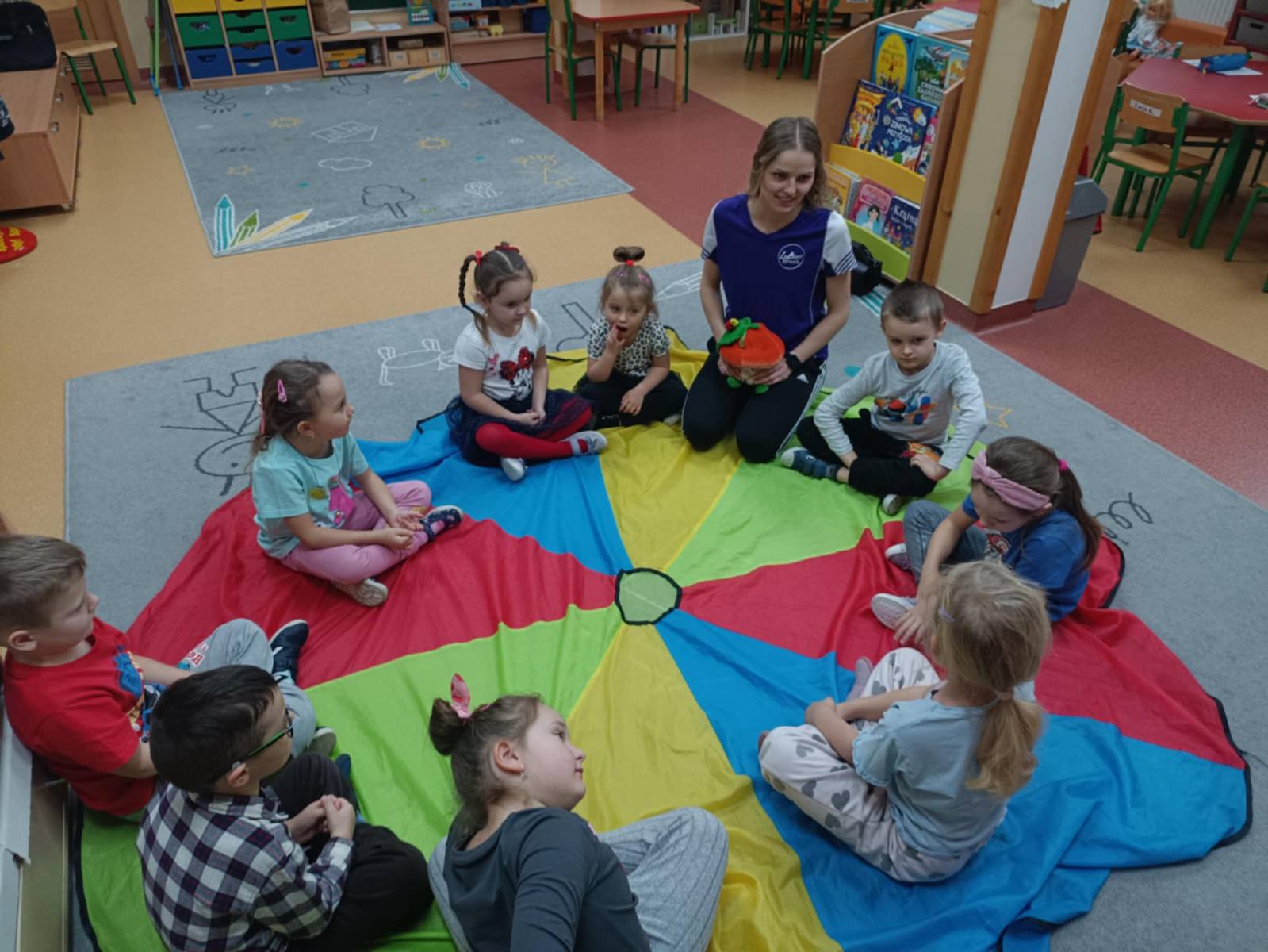 W przedszkolu instruktorka Pani Karolina zaprezentowała, jak będą wyglądały przykładowe zajęcia w każdy poniedziałek. Dzieci uczestniczyły w zabawach z chustą animacyjną, tańczyły przy muzyce oraz brały udział w różnych grach ruchowych. Zajęcia mają charakter rytmiczno-ruchowy – łączą elementy tańca, muzyki i zabaw ruchowych, wspierając rozwój koordynacji, poczucia rytmu, sprawności oraz motoryki dużej i małej. Zachęcamy do zapoznania sie z ofertą 🙂